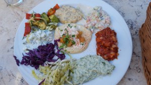 Piatto tipico, verdure speziate e al centro l’immancabile Humus di ceci
